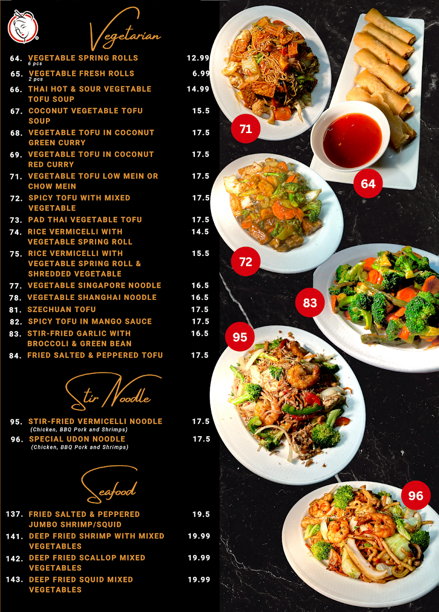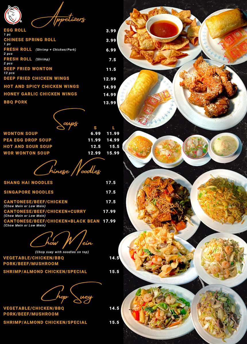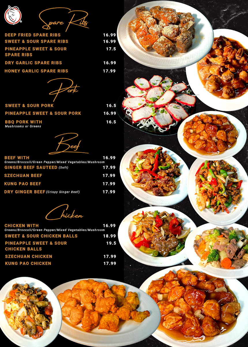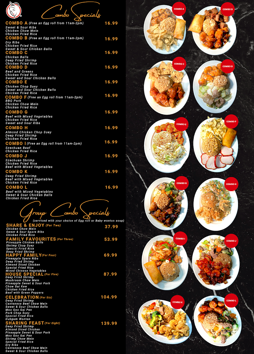 Deep Fried Shrimp, Almond Diced Chicken, Pineaple Sweet & Sour Pork, Moo Goo Gai Pen, Shrimp Chow Mein, Special Fried Rice, Dry Ribs, Cantonese Beef Chow Mein, Sweet & Sour Chicken Balls
