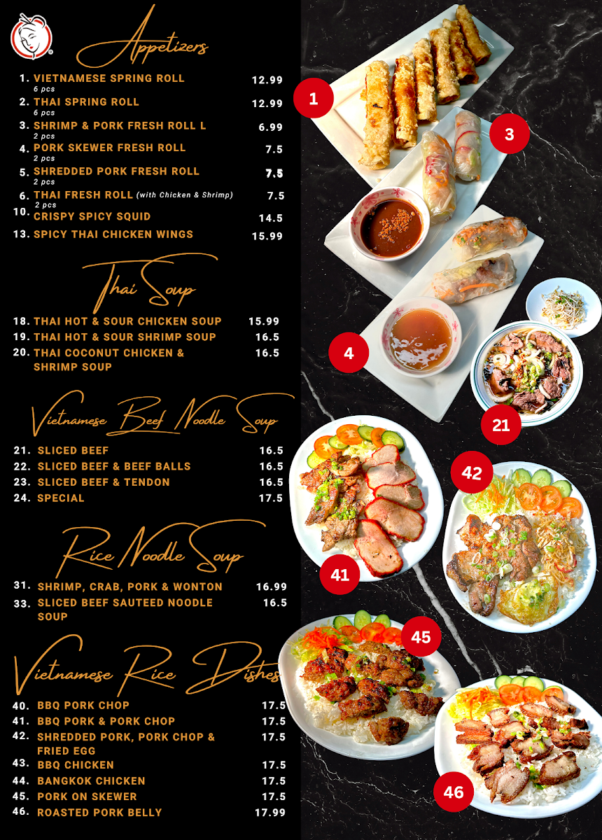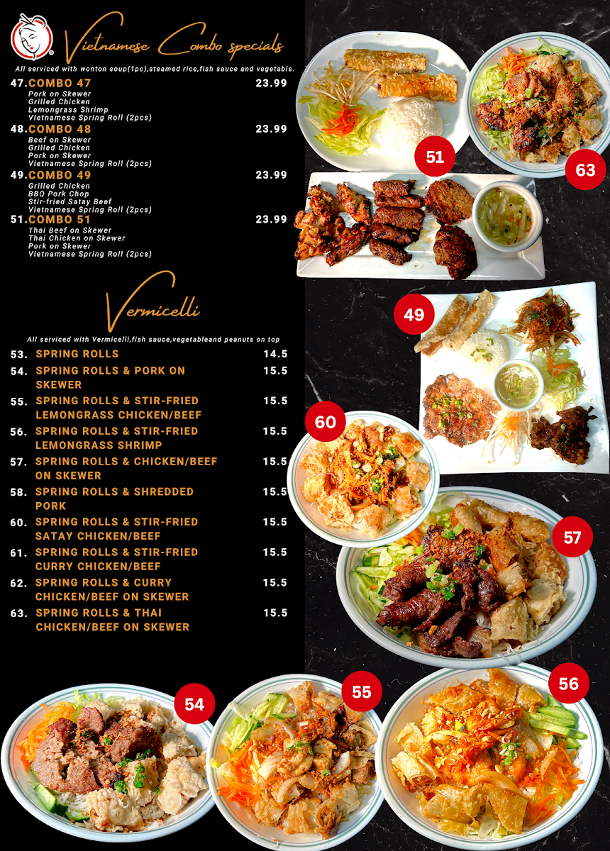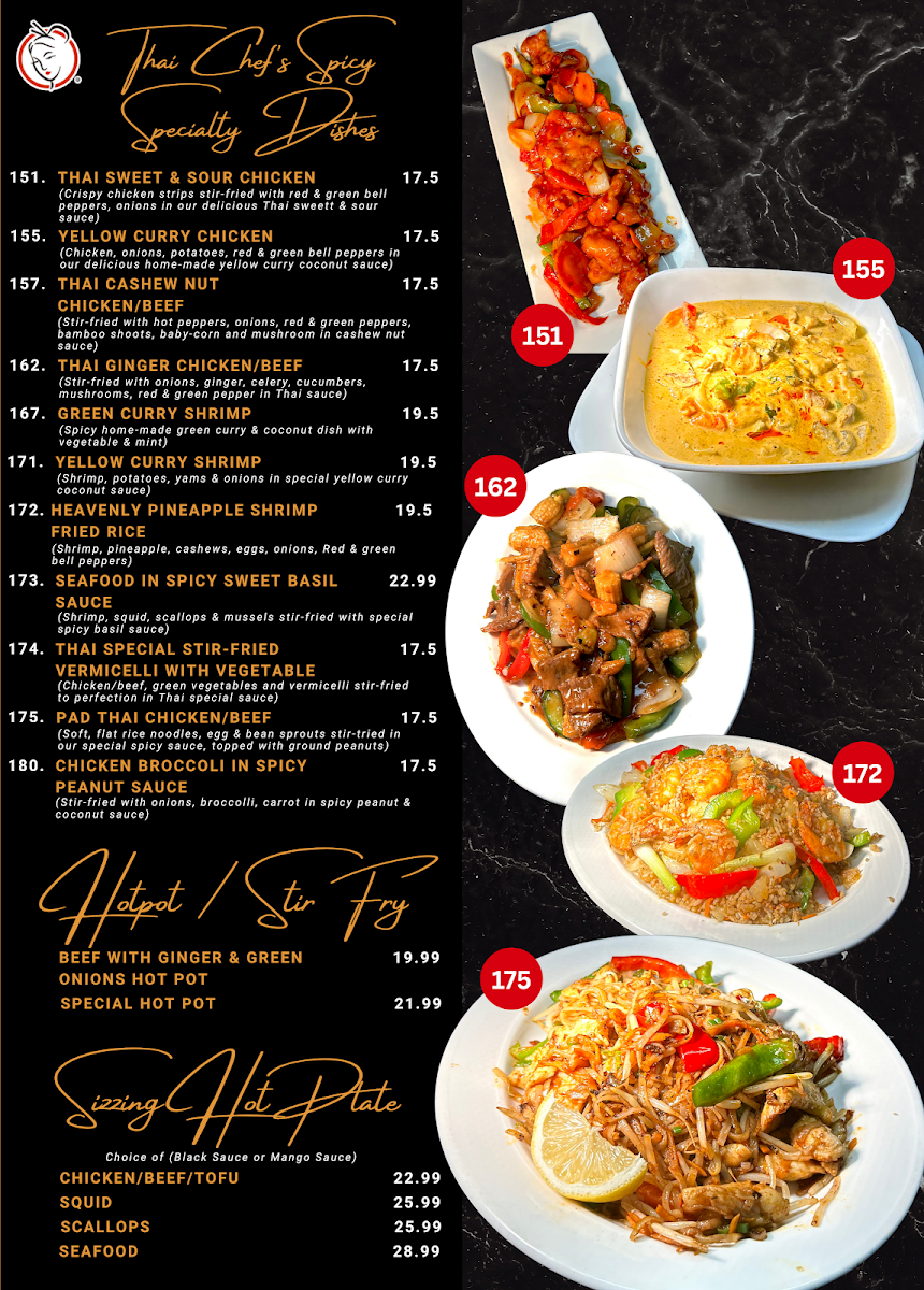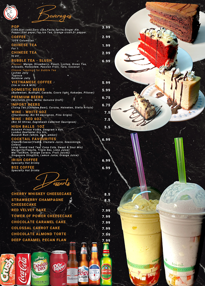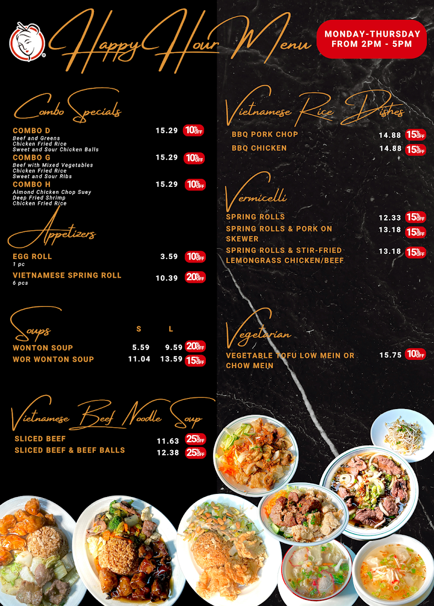 Deep Fried Shrimp, Almond Diced Chicken, Pineaple Sweet & Sour Pork, Moo Goo Gai Pen, Shrimp Chow Mein, Special Fried Rice, Dry Ribs, Cantonese Beef Chow Mein, Sweet & Sour Chicken Balls